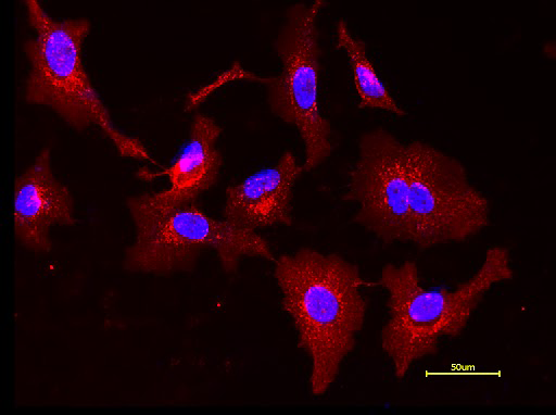 图2. 将HeLa活细胞用5 µg/mL 的AF594小麦胚芽凝集素(WGA)探针(#25509)染色 30 分钟,再用 Hoechst 33342(#17535)染色。使用 Cy3/TRITC 和 DAPI 滤光片组在荧光显微镜获取图像。