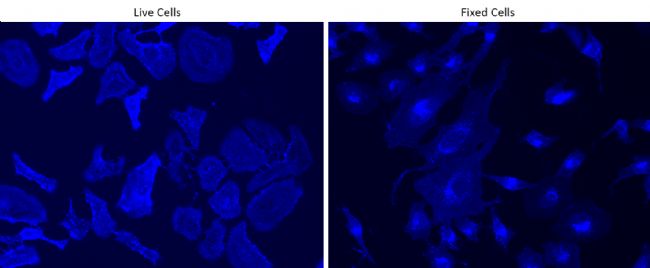 图3. 用 10 µg/mL 的 iFluor350小麦胚芽凝集素 (WGA)探针 对活的和固定的 HeLa 细胞进行染色 30 分钟。使用 DAPI 滤光片组在荧光显微镜上获取图像。